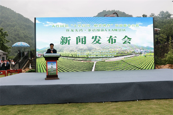 发布会上,大竹园镇人民政府镇长郑涛向大家介绍了大竹园镇茶旅融合及龙头湾茶语漫游景区有关情况,龙头湾茶语漫游景区形象大使单东培做了景区推介。