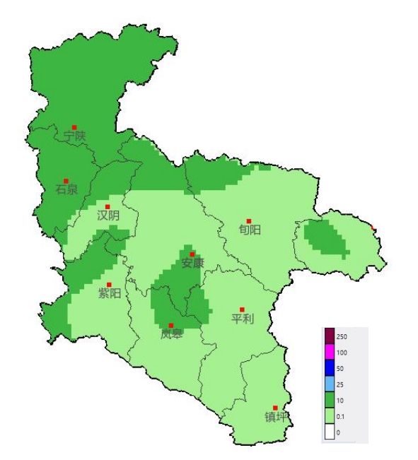 25日下午至夜间我市大部以小雨或小到中雨为主(0.1~15 毫米),局地伴有短时阵风和雷电天气,西部、北部(宁陕、石泉、汉阴、紫阳、汉滨北部、旬阳北部)等县(区、市)个别镇办可能出现短时强降水(最大小时雨强:10~25 毫米),局地降水具有极端性,累计降水量可能超过 40 毫米。