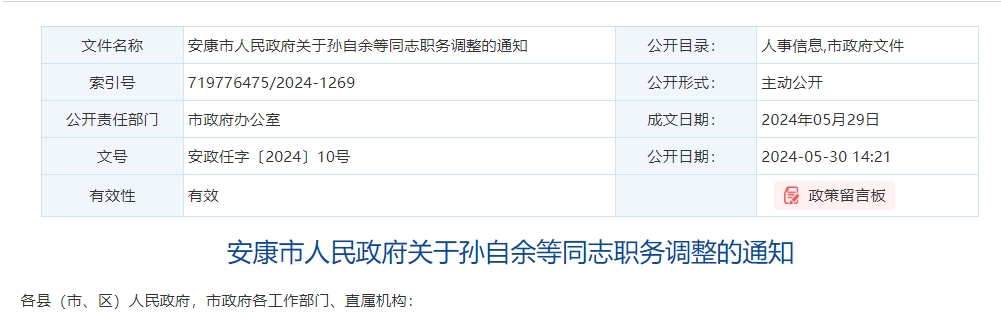 安康市人民政府关于孙自余等同志职务调整的通知