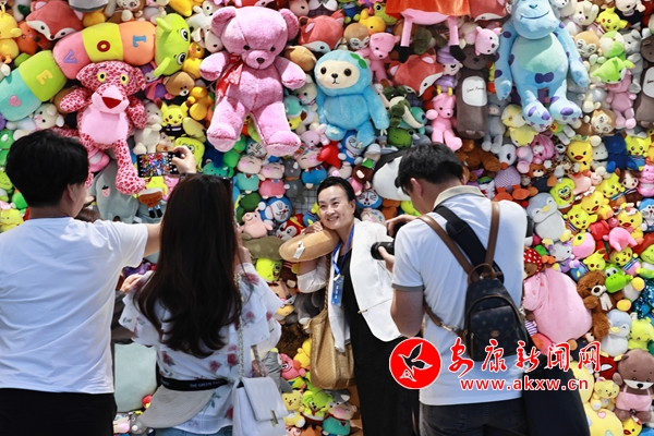 采访团在恒口示范区毛玩中心拍照打卡。记者 潘润生 摄