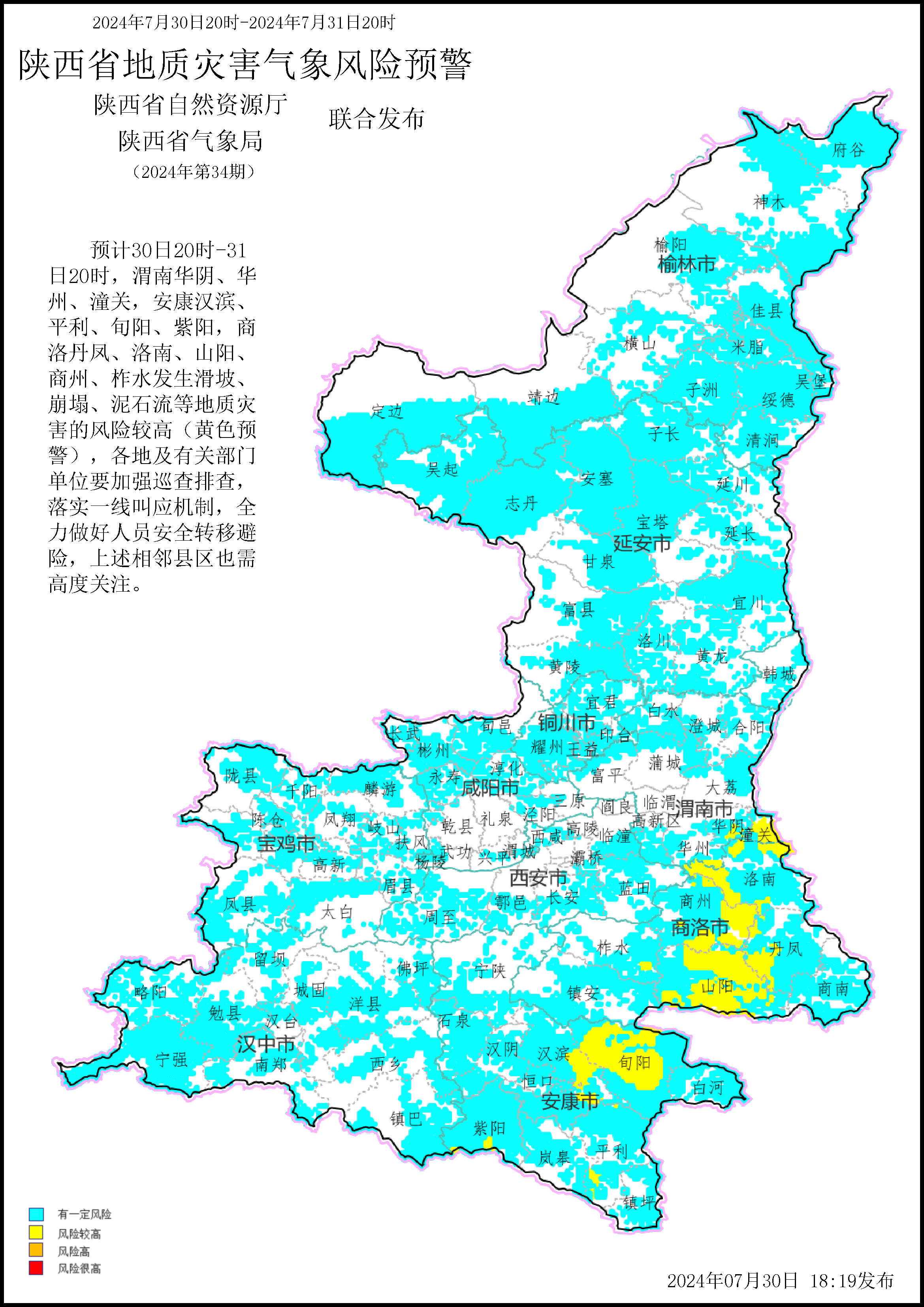 陕西省自然资源厅与陕西省气象局联合发布地质灾害气象风险预警:预计2024年7月30日20时—31日20时,渭南华阴、华州、潼关,安康汉滨、平利、旬阳、紫阳,商洛丹凤、洛南、山阳、商州、柞水发生滑坡、崩塌、泥石流等地质灾害的风险较高(黄色预警),各地及有关部门单位要加强巡查排查,落实一线叫应机制,全力做好人员安全转移避险,上述相邻县区也需高度关注。 wXr安康新闻网