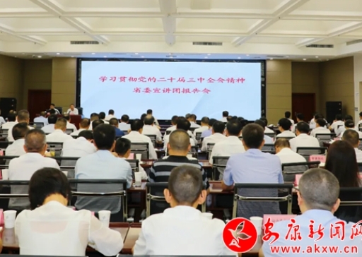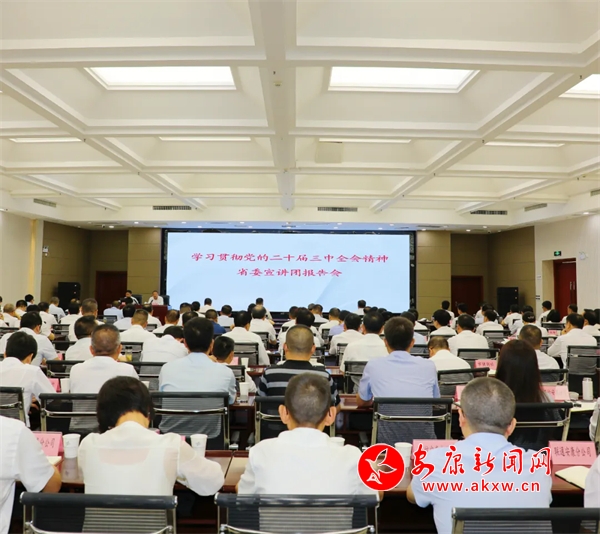 本网讯(记者 艾蓓)根据省委统一部署,8月5日,学习贯彻党的二十届三中全会精神省委宣讲团报告会在我市举行。省委宣讲团成员、省委副秘书长、省委政研室主任王飞作宣讲报告。市委书记武文罡主持报告会。市人大常委会主任王彪、市长王浩、市委副书记高晶华和在家市级领导出席会议。