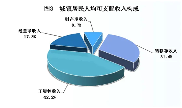 全市城镇居民人均可支配收入33639元,比上年增加1663元,增长5.2%。其中,工资性收入14181元,增长5.0%,占可支配收入的比重为42.2%;经营净收入5995元,增长4.7%,占比17.8%;财产净收入2910元,增长5.8%,占比8.7%;转移净收入10553元,增长5.6%,占比31.4%。
