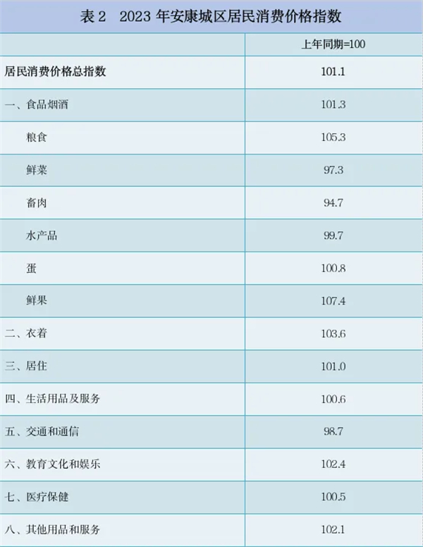 2023年,安康城区居民消费价格比上年上涨1.1%。