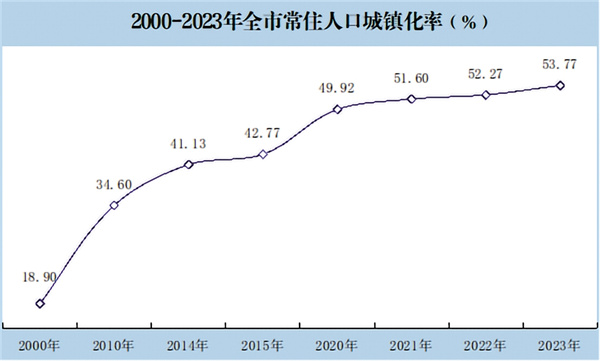 城镇化步伐明显加快。1949年,安康总人口146.75万人,其中农业人口占89.4%,属于典型传统的农村社会,交通不便,人员相对封闭不流动。改革开放后,市场经济体制逐步建立,特别是2000年撤地设市,对安康具有划时代和里程碑的意义。2021年旬阳撤县设市,成为陕南首个县级市,标志着全市城镇化步伐迈向更高水平。全市抓住东部劳动密集型产业向中西部转移的机遇,依托易地搬迁集中安置点,大力兴办新社区工厂,把农民变为居民,大力开展新环境、新服务、新产业、新民风、新生活“五新”社区创建工作,完善配套设施,健全服务体系,城镇化建设步伐显著加快。2023年,全市户籍人口300.75万人,常住人口245.72万人。常住人口城镇化率由2000年的18.9%,提高到2023年的53.77%,23年间提高了34.87个百分点。