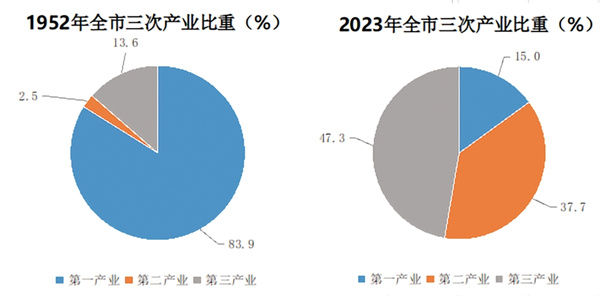 产业结构日趋优化。1952年,全市三次产业比为83.9︰2.5︰13.6,产业结构呈“一、三、二”模式,为典型的农业市,随着工业经济和第三产业的不断发展,全市第一产业比重逐年下降,二、三产业比重逐年上升,2012年三次产业比为19.4︰42.7︰37.9,第一产业占比首次低于20.0%,第二产业突破40.0%,产业结构呈“二、三、一”模式;随着第三产业不断壮大,2020年占比45.3%,跃居三产之首,呈“三、二、一”模式,并连续保持4年,2023年全市三次产业之比15.0︰37.7︰47.3,以服务业为主的产业结构加速形成。