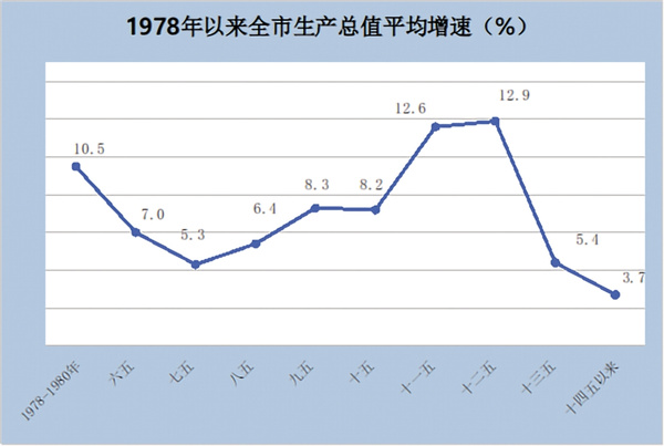追赶超越步履坚实。从增速看,“六五”到“十五”年均增速为个位数;“十一五”“十二五”时期发展较快,年均增速两位数,“十三五”年均增长5.4%,“十四五”前三年平均增长3.7%。从具体年份看,2007—2016年连续10年保持两位数增长,其中2012年增长15.2%。自2009年起,全市GDP增速持续高于全省平均水平,尤其是2015年跃居全省第一,2015—2019年连续5年保持全省首位,呈后来居上、追赶超越之势。2020年受疫情冲击,增速回落至全省第9位,2023年全市经济平稳恢复,增长1.7%,发展进入新常态。