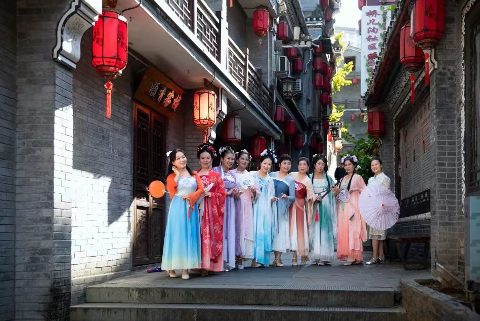 桥儿沟景区:10月2日,在桥儿沟街区,一场汉服快闪秀活动在这里精彩上演,吸引大批游客随着巡游队伍畅游最美古街,充分展示了传统服饰的文化魅力。