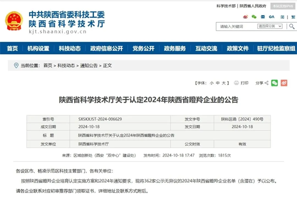 10月18日,陕西省科学技术厅公布了2024年度陕西省瞪羚企业名单,经过层层筛选和严格评审,安康大数据公司成功入选“陕西省瞪羚企业”榜单。