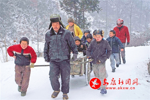 2007年冬天,学校水管上冻,师生齐力运水确保厨房用水。