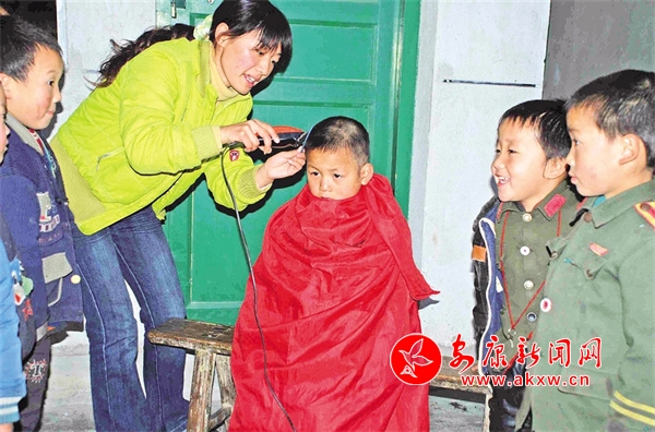 兰坪小学老师为学生理发。