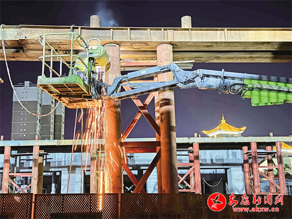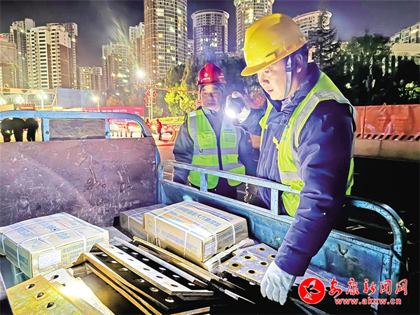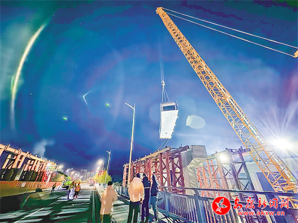 11月25日晚,工程人员检查桥梁部件。
