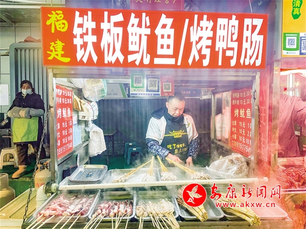 对此,在距离不远的金州路双堤巷摆摊多年的福建人严国强有着更深的感触。“我来安康有20多年了,主要卖烤鱿鱼,租个铺子不划算,就这种小车又方便成本也低。最开始我在市中心广场附近摆摊,那时候流动性比较大,顾客也不太放心在我们这种小摊上消费。这几年政府倡导‘夜经济’,我就干脆搬过来了,今年给我们统一办理了营业执照、食品摊贩登记备案卡,顾客一看这些证件,消费起来更安心不说,对我们也是一种保障,能够固定在一个地方长久地将生意做下去,水电这些也不用自己再想办法解决,我很知足了。”