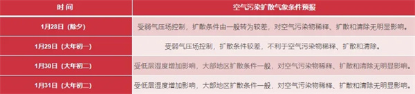 1月24日至27日,受雨雪降温天气影响,扩散条件较好。1月28日至29日,地面气压场转弱,扩散条件转差,我市大部空气质量以良至轻度污染为主,烟花爆竹集中燃放时段可能出现短时重度或以上污染,首要污染物为PM2.5。1月30日至31日,受低层湿度增加影响,扩散条件一般。2月1日至4日,受冷空气清除作用影响,扩散条件较好。