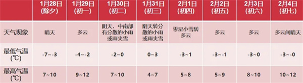 春节期间,除夕至初一,天气晴朗,适宜出行游玩,但早晚气温低,注意适时增减衣物。初二至初四云量较多,有分散性小雨或雨夹雪,高山地区有小雪,去高山景区的公众需注意做好防寒保暖和防滑措施。
