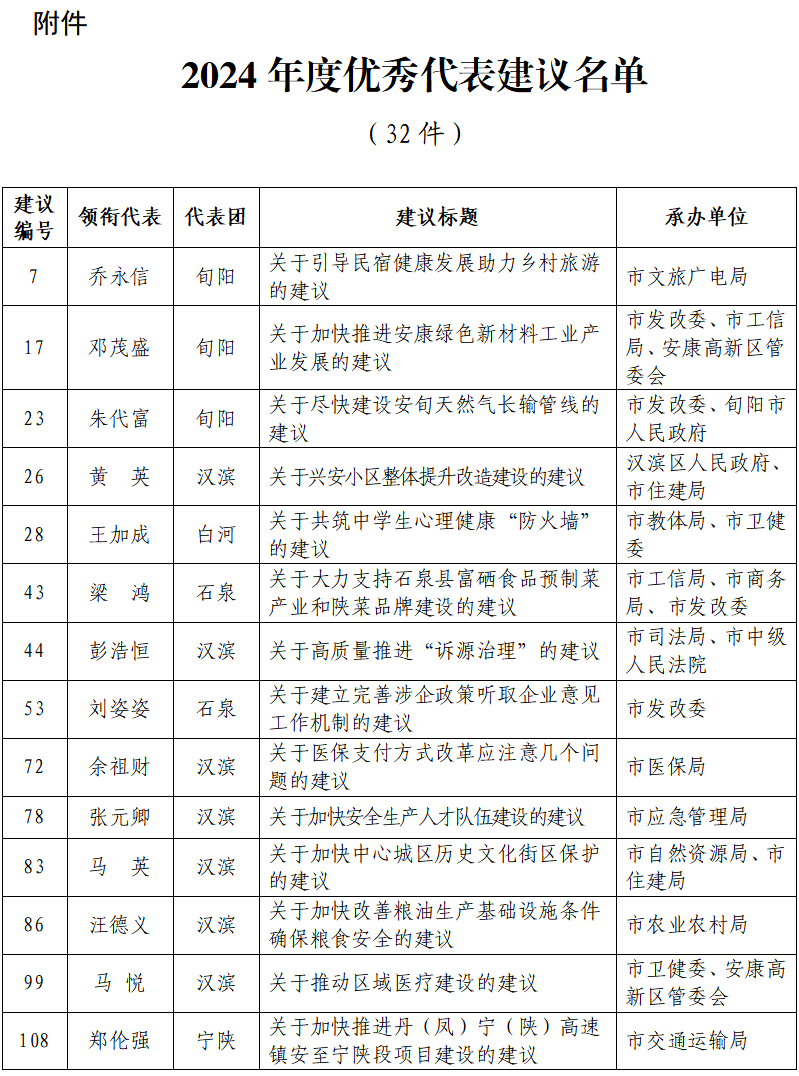市五届人大五次会议以来,全体市人大代表紧紧围绕全市中心工作和人民群众普遍关心关注的热点难点问题,依法履行职责,积极建言献策,共提出了256件代表建议,这些建议主题明确具体、建议切实可行、行文简洁规范、效果可期可见,为推进我市经济社会发展和民主法治建设凝聚了智慧、增进了共识、贡献了力量。为树立典型、推进工作,市人大常委会决定,对乔永信等代表提出的32件优秀代表建议予以通报表扬。