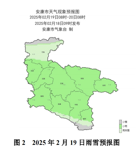 本网讯 2月18日11时,市气象台发布重要天气报告:2月19日至23日,我市有两轮弱降水降温天气,日最高气温下降显著。受高原槽影响,预计19日、22日我市有两轮弱降水降温天气;后期受中纬度平直气流影响,我市云量较多。预计2月19日至23日我市以阴天天气为主,多弱降水过程,高山地区有雨夹雪或小雪。主要降水时段在19日、22日,川道地区小雨(1~5mm),高山地区小雨或中雪(2~6mm);秦巴山区最大积雪深度0~2cm;期间伴有弱降温天气。受冷空气和雨雪天气共同影响,我市日最高气温下降显著,降幅5~7℃。