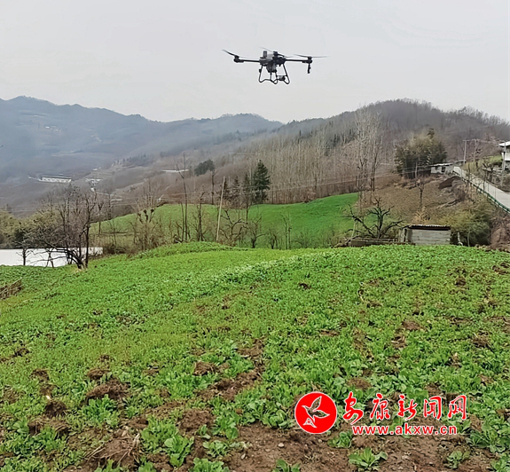 眼下正值春季管护黄金期,在白河县冷水镇兴隆村粮油示范田里,无人机在油菜田上方来回穿梭,均匀细密地喷洒农肥,抑制病菌繁殖,提高油菜产量。周紫薇 摄