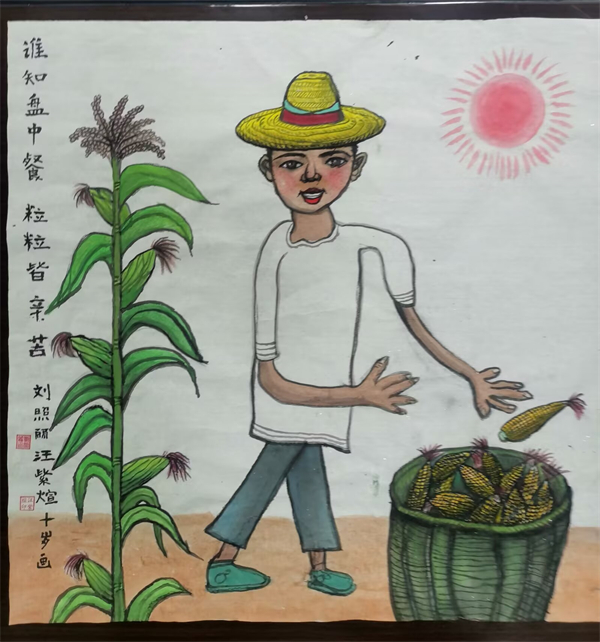 四年级的汪紫煊在参加夏令营时,在玉米田里看到一幕,深深地吸引了她,一位农民伯伯戴着草帽在烈日下,把玉米装进筐里。曾经学过的诗句在她脑海里浮现,文字变成了立体的画面,她为自己这幅画起名《谁知盘中餐 粒粒皆辛苦》。汪紫煊觉得,这种吃苦耐劳的精神要发扬,更要珍惜粮食,感受粮食的来之不易。
