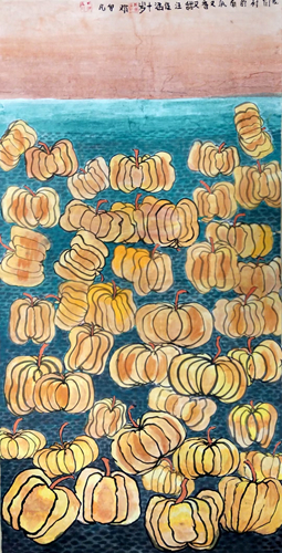 画面上紧密排列的南瓜,给人一种饱满、充实的视觉感受,显示了收获的丰盛,也表达出一种对富足生活的满足和喜悦之情。汪佳涵选择了家乡常见的农作物作为自己的绘画主题,直白地表达了对家乡的认可和赞美,展示了她对家乡生活的认同和热爱。