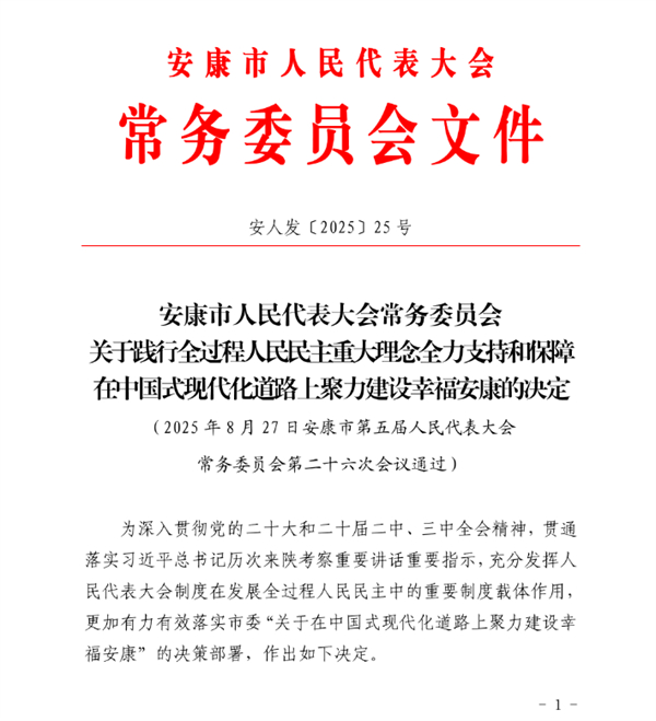本网讯(通讯员 周清华 张凡)8月27日,安康市五届人大常委会第二十六次会议作出《安康市人民代表大会常务委员会关于践行全过程人民民主重大理念全力支持和保障在中国式现代化道路上聚力建设幸福安康的决定》(以下简称《决定》),并自印发之日起实施。以地方人大常委会作出重大事项决定的形式,将党的主张通过法定程序转化为全体人民的共同意愿,是安康市人大常委会强化担当、依法履职的创新实践,是围绕中心、服务大局的务实举措,必将为在中国式现代化道路上聚力建设幸福安康注入坚实的人大力量。