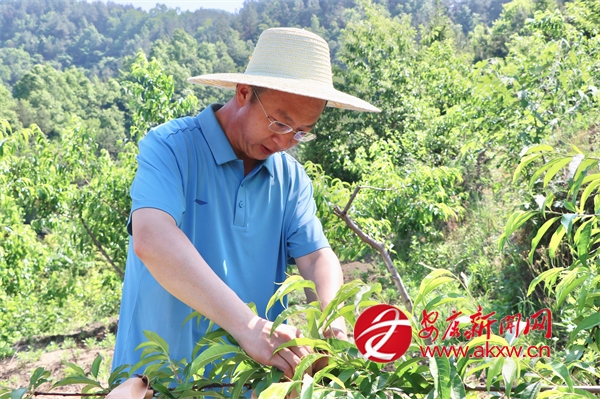 陕煤集团派驻汉阴县双河口镇幸和村第一书记高勇正在给桃树套袋