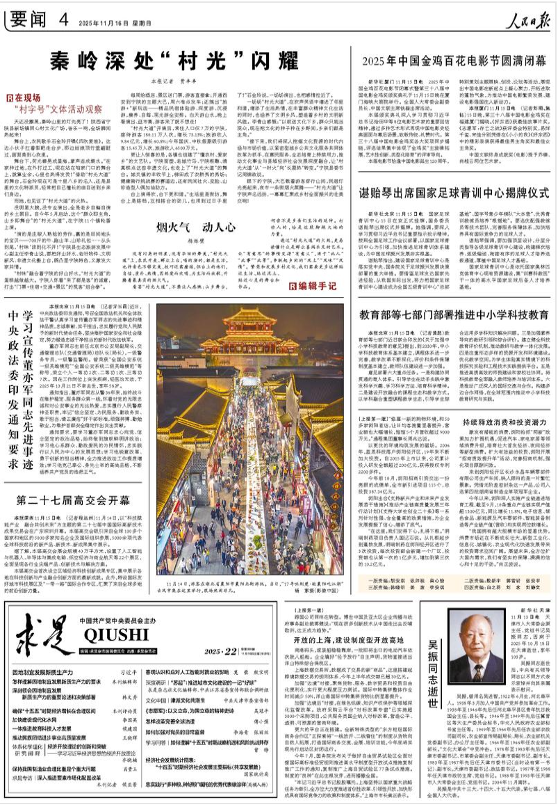 《秦岭深处“村光”闪耀》一一宁陕村光大道专题报道11月16日在人民日报4版要闻头条刊发,并配发《烟火气 动人心》编辑手记评论员文章。