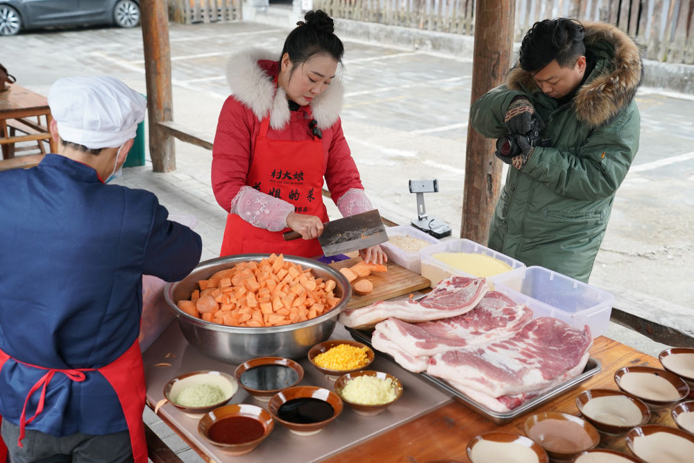2月21日,在安康市汉滨区,李花(中)在她的农家乐院内,制作准备用于网络销售的蒸碗,并拍摄短视频。李花和丈夫从经营农家乐起步,后通过短视频和直播等方式,在……