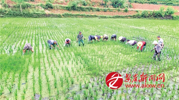 6月3日,石泉县城关镇抢抓农时,组织人力物力开展科学田管和绿色防控工作,夯实秋粮稳产基础。图为丝银坝村集体经济合作社组织农户开展稻田除草作业。 董长松 摄……