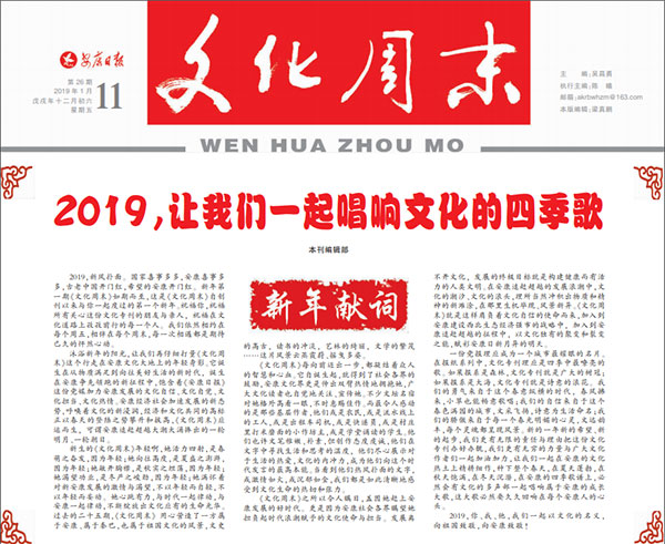 2019,新风扑面。国家喜事多多,安康喜事多多,古老中国开门红,希望的安康开门红。新年第一期《文化周末》如期而至,这是《文化周末》自创刊以来与你一起度过的……