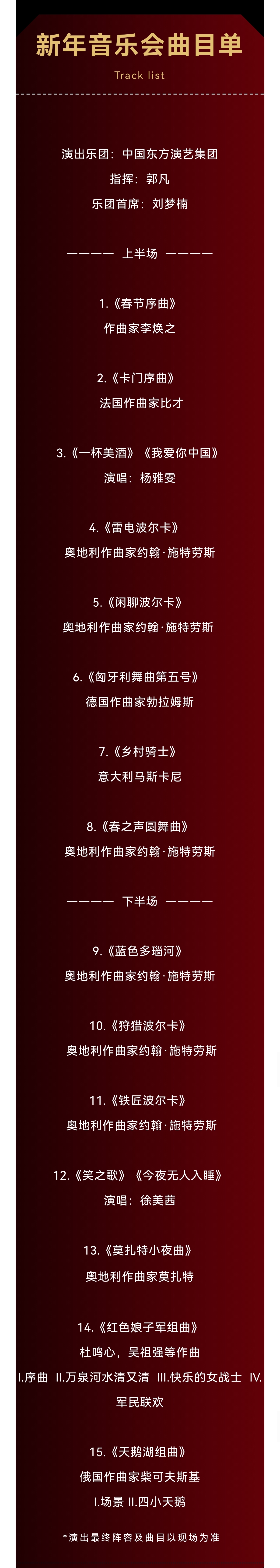 本场音乐会以“喜迎新年”为篇章,精粹二十首左右的中外“新年代表”经典乐曲,独具中国东方韵味的名曲和维也纳新年音乐会的传统乐曲,曲目中西合璧,加入极富创意的乐曲编排,欢快宏大、激情洋溢的音乐风格,让跨年氛围与交响融合得浑然一体,在欢乐喜悦的音乐旋律中表达对新年新气象的期盼与向往。
