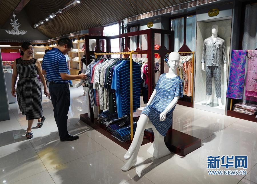 7月19日,游客在石泉蚕桑文化园内挑选丝绸服装。新华社记者 邵瑞 摄