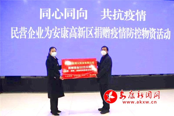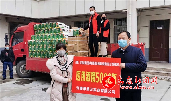 2月1日,安康市博元实业有限公司为高新区慈善协会捐款50万元,并捐赠价值41000元的酒精2000瓶/500毫升,用于支持高新区各社区和51个村的抗疫工作。同日,向汉阴县慈善协会捐款20万元,捐赠价值118900元的酒精(200桶/2升,5000瓶/500毫升),由汉阴县疫情防控工作指挥部统筹安排用于汉阴县疫情防控工作。