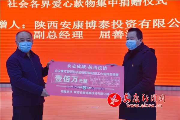 仪式现场,陕西安康博泰投资有限公司董事长、温州人赵章汉,委托专人向安康市疫情防控指挥部捐赠人民币100万元,和价值8余万元的消毒液1000桶、方便面100箱、矿泉水100箱、蔬菜1000公斤等物资,助力安康战“疫”。