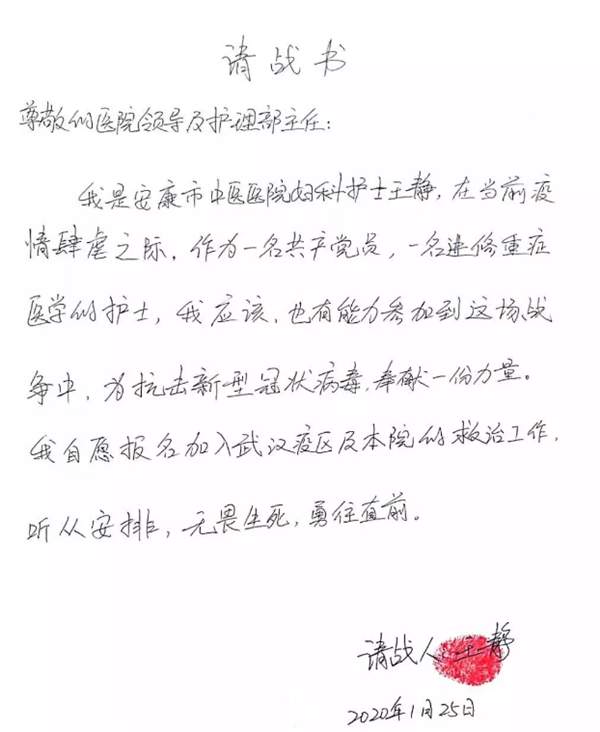 “在当前疫情肆虐之际,作为一名共产党员,一名进修重症医学的护士,我应该,也有能力参加到这场战争中,为抗击新型冠状病毒贡献一份力量,我自愿报名加入武汉疫区及本院的救治工作,听从安排,无畏生死,勇往直前!”请战书中的一字一句,都表达着王静驰援武汉的坚定决心,都沉淀着一个共产党员的初心使命。虽为人妻、为人母,为人女,但是当疫情来临,王静义无反顾主动请缨,化身最美逆行者。