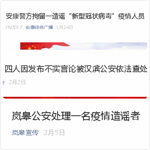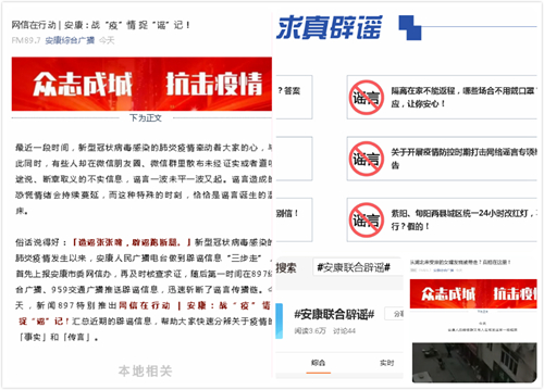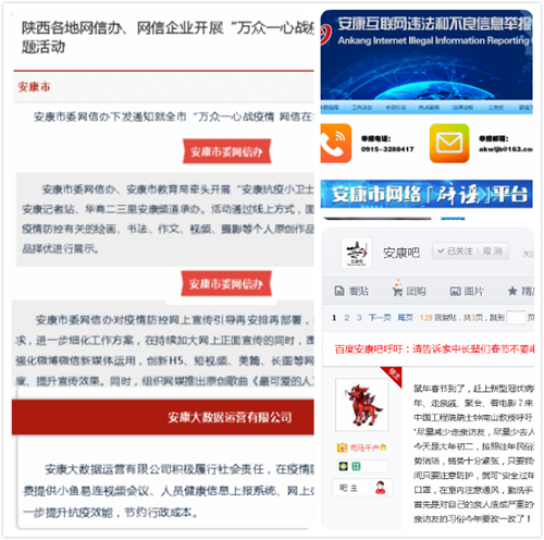 权威发声破谣言。建立完善了网上“涉疫情”信息资源共享、会商研判工作机制,对经核查确认的“网络谣言”立即启动网上联合辟谣工作机制进行公开辟谣、还原真相,快速有效切断谣言传播链条。截至目前,累计组织发布“网传:恒口一家人全部被感染?官方正式通报!”、“从湖北来安康的女婿发烧被带走?真相在这里!”等网上联合辟谣15期,查删各类不当言论、不实信息230余篇(条),策划发布《网信在行动|安康:战“疫”情 捉“谣”记!》1期,有效抑制了网上不良信息滋生蔓延。