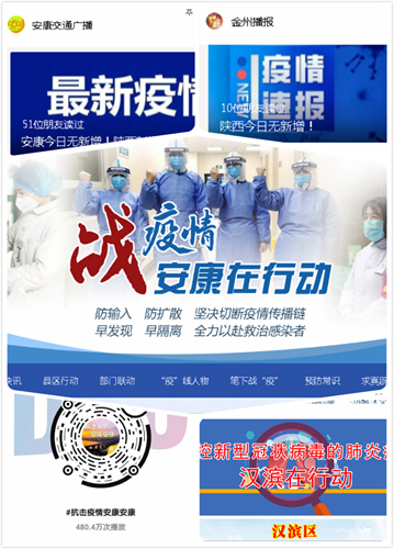 主题网宣扬正气。围绕网上舆论关注点和群众诉求点,科学研判、把握节奏,统筹全市各网媒平台策划设置“战疫情•安康在行动”“抗击疫情安康安康”等网络宣传专题和“两微一抖”互动话题,灵活运用微视频、H5、动漫、图文、九宫格等形式,集中采编刊发《我市全力推进疫情防控工作》《刚刚,安康市首例治愈患者出院》《新型冠状病毒感染的肺炎防控小贴士》等科普宣教、正面宣传信息1.02万篇(条)、视频300多个,网民综合浏览量达千万级。安康原创歌曲《最可爱的人》、安康全民抗疫主题诗朗诵《眼睛》、汉滨区微视频《十天,他们建成安康市汉滨区的“火神山”医院!》、紫阳县抗“疫”战歌MV《我想看到你的脸》、平利县H5《战疫情•“十个瞬间”总有一个感动你》等网络文化作品吸引广大网民共鸣和点赞,全市群防群控氛围更加浓厚,网上正能量持续充沛。