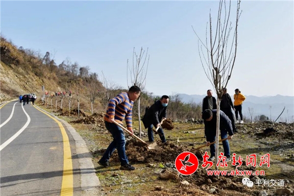 本网讯(通讯员 陈本利)阳春三月、万物复苏。3月11日上午,平利县城关镇纸坊沟村新修的泊油路沿线,全县各党政机关、企事业单位干部职工一字摆开,有的扶树、有的铲土、有的浇水,平利县2020年春季义务植树活动正欢快的气氛中有序开展。在大家精心栽植下,一株株樱花精神抖擞的挺立在路旁,将这条通村公路装扮的焕然一新。同样义务植树绿化美化公路的场景在广佛镇塘坊村、西河镇段家河村、长安镇公路沿线同时展现。