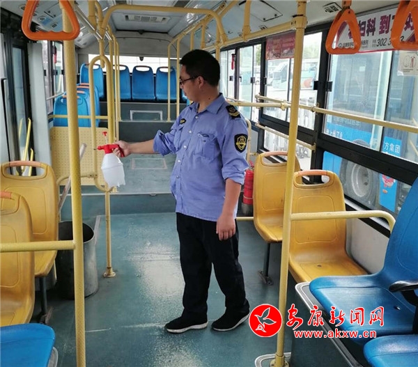 疫情爆发初期,市公交公司早部署、早安排,积极做好防护口罩、消毒物品的采购和储备工作,向一线驾驶员送去口罩和84消毒液。为了让车辆“彻底消杀、健康出发”,公司在市内设置2个定点车辆消杀点,采取发车前、收车后的消毒方式,从车顶棚、车门、地板到车厢内部设施进行全面清扫、消毒,对乘客频繁接触的扶手、座椅进行重点消毒擦拭,不留死角。