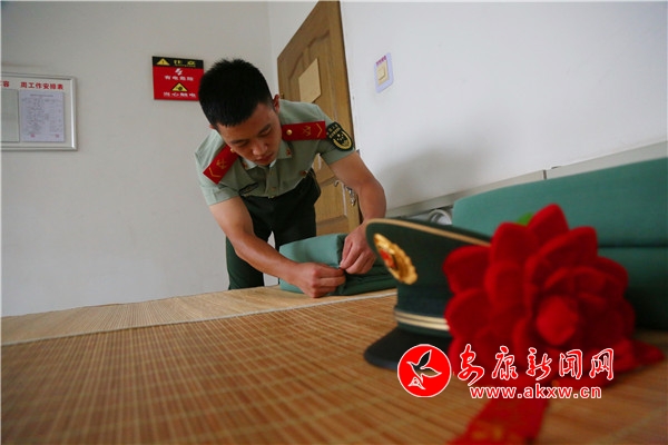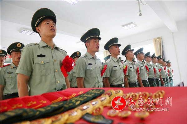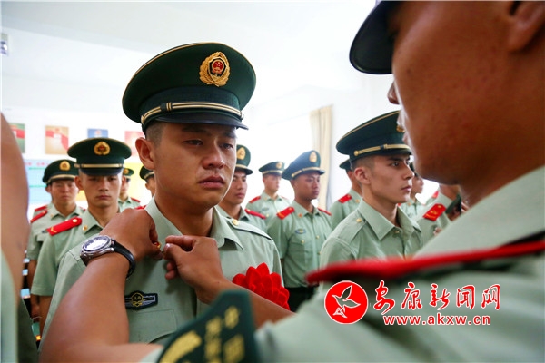 “为满服役期士兵卸军衔……”离队前,留队战友为退伍老兵卸下警衔、领花、帽徽和胸标,为他们戴上“光荣花”。此时此刻,训练场上的汗流浃背、执勤路上的日晒雨淋、比武场上的斩金夺银、战友之间的情同手足,一幕幕,一帧帧,如此真切,如此清晰,一切的一切都成了最美好的回忆。“我舍不得这心爱的红肩章、绿迷彩。”退伍老兵冯欢看着卸下的肩章潸然泪下。