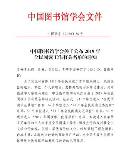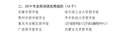 全国16个单位被评为“2019年全民阅读优秀组织”,其中高校图书馆4个,公共图书馆12个。安康市图书馆在2019年全民阅读宣传工作中,积极宣传和践行社会主义核心价值观,弘扬中华优秀传统文化,组织策划开展了“全市同读一本书”、“全市同读一小时”、“全市同读一类书”等“全市同读”系列活动,形成了全市一盘棋的业务格局,充分发挥了市馆的“中心引领”作用,深入推进了全民阅读工作。