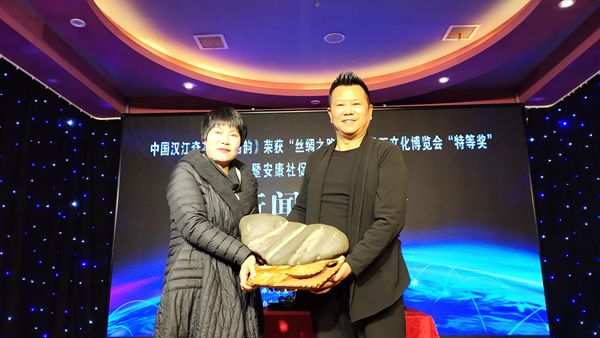 新闻发布会上,中国观赏石鉴评师、汉江流域汉江石专家组成员王铁石同志介绍汉江奇石《丝路韵》获奖情况。安康市政协原副主席李启良、黄秀玲上台为安康社促会奇石协会成立揭牌。安康市社促会奇石协会向石泉县金蚕小镇鎏金铜蚕博物馆赠送了汉江奇石《蚕宝宝》。