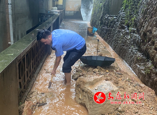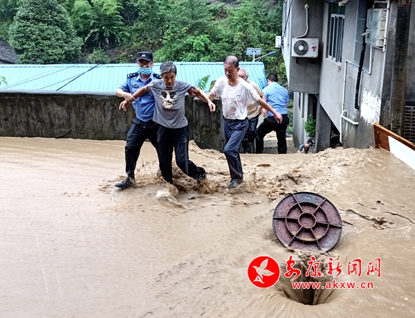 8月22日,紫阳县汉王镇普降大暴雨,汉王镇上街道因雨量大发生洪水内涝,直接威胁街道居民住户生命财产安全。辖区民警立即组织群众用木板挡住洪水,防止洪水进入居民楼浸泡发生房屋垮塌,同时冒着危险将街道下水道井盖掀开,分流泄洪。