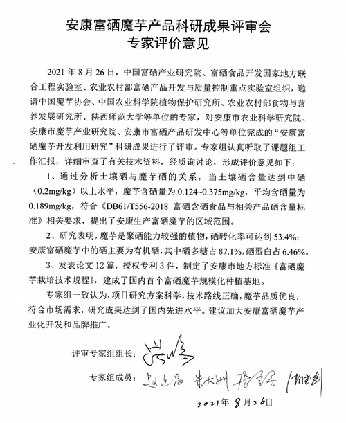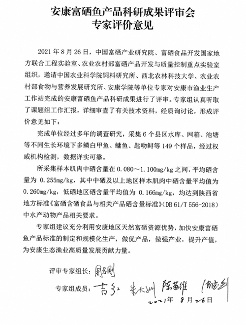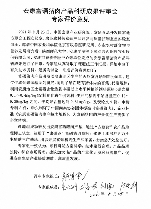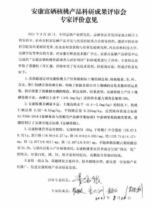 本次评审中,专家组认真听取了课题组工作汇报,详细审查了有关技术资料,经质询讨论后一致认为:四大富硒特色产业课题研发方案科学、技术路线合理,研究成果达到国内先进水平,天然富硒是安康得天独厚的资源优势,培育开发出的产品品质优良,符合市场需求。建议充分利用安康地区天然富硒资源优势,加快富硒特色产业标准的制定和规模化生产,做优产品、做强产业、提升产值,加大该产品的产业化开发和品牌推广力度,促进产业提质增效。
