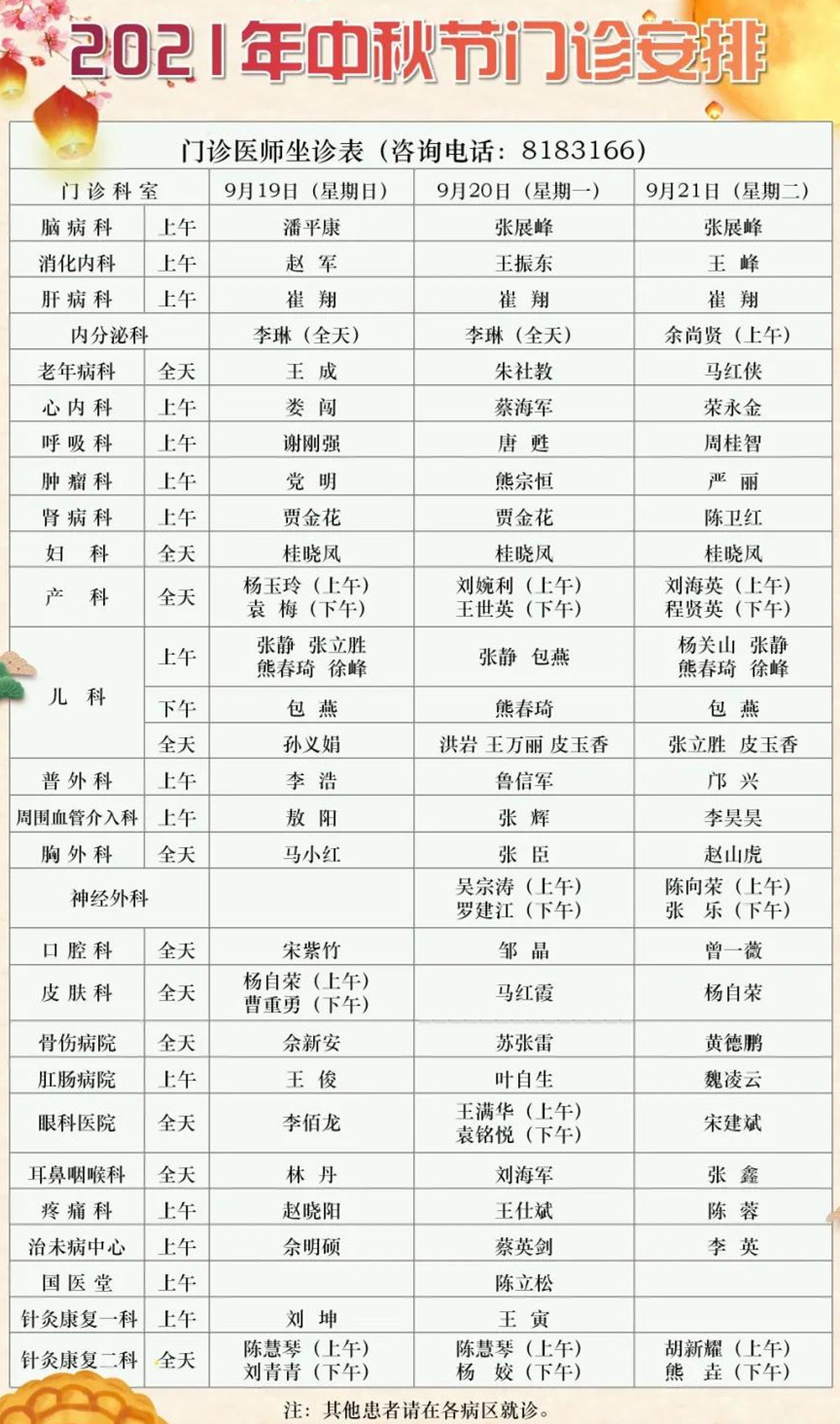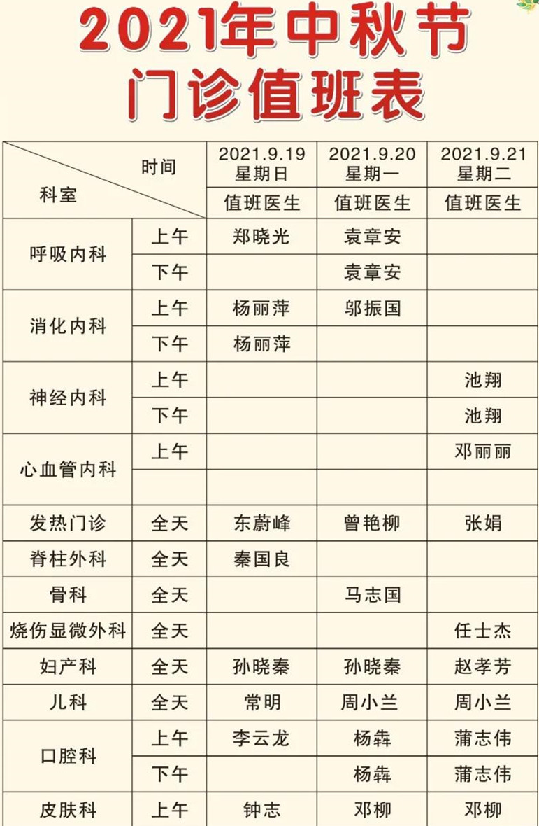 经医院研究决定,9月19日(星期日)至21日(星期二)中秋节放假调休3天,9月18日(星期六)正常上班,执行周一门诊排班。
