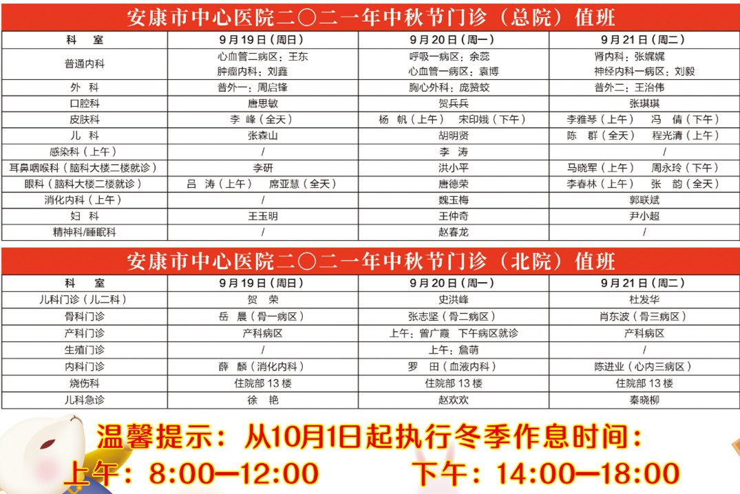 本网讯(通讯员 黄申奥)2021年农历中秋佳节将至,为保障人民群众身体健康,方便群众节假日期间就医就诊,安康市中心医院、安康市人民医院、安康市中医医院等陆续发布中秋假期放假通知及门诊排班安排。
