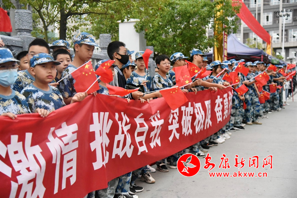 7时30分,校门两侧早已站满了初一的学弟学妹们,他们挥动着手中的小红旗,为即将远足的哥哥姐姐们加油助威。浩浩荡荡的队伍,在军训教官以及校领导、老师们的带领下,踏上远足的征途。整齐的迷彩方队,竖起的一面面班旗,成为晨曦中最亮丽的风景。同学们精神抖擞,一路欢歌,一路笑语,口号声、呐喊声此起起伏。