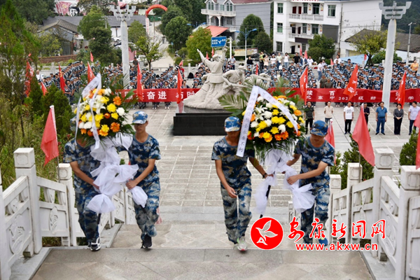 在战斗纪念碑前,大家集体默哀,并向烈士敬献花篮。讲解员生动讲述着牛蹄岭的战斗事迹,在场的每一位仿佛回到了那个战火纷飞的年代,真切感受到革命先烈不怕牺牲、甘于奉献的红色精神。随后,校党总支副书记徐信涛作了题为“赓续红色基因,肩负祖国未来”的报告。徐书记从18岁烈士陈祥榕以身护国讲到东京奥运会上14岁少女全红婵为国争光,再到习近平总书记来陕考察对青年学生的深切寄语,希望同学们在高中新起点上,扣好人生的“第一粒扣子”,立大志,明大德,成大才,担大任,以自己的优异成绩告慰革命先烈,以自己的优异表现实现强国梦想。接着,在高一年级郭红梅老师的带领下,全体学生面对纪念碑庄严宣誓,铮铮誓言,清澈响亮,无不透露出新时代少年报效祖国的坚定信心。