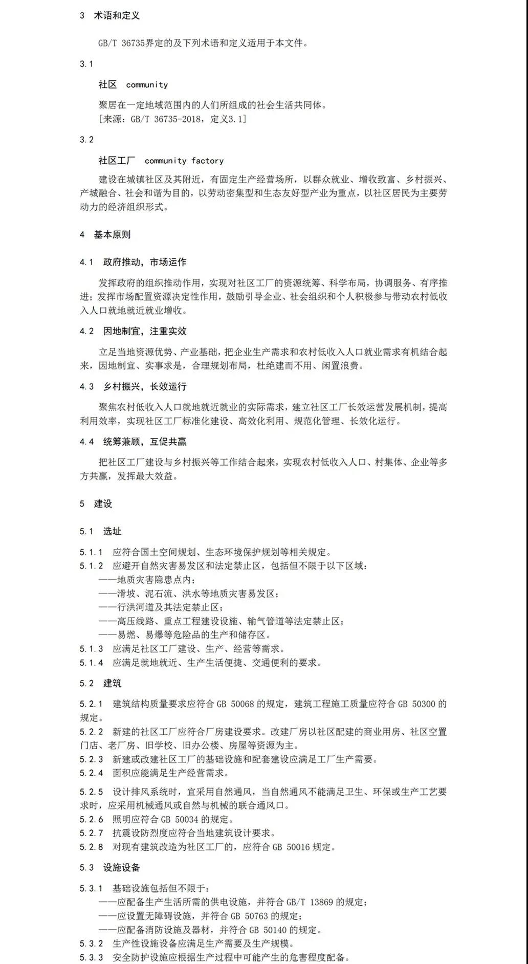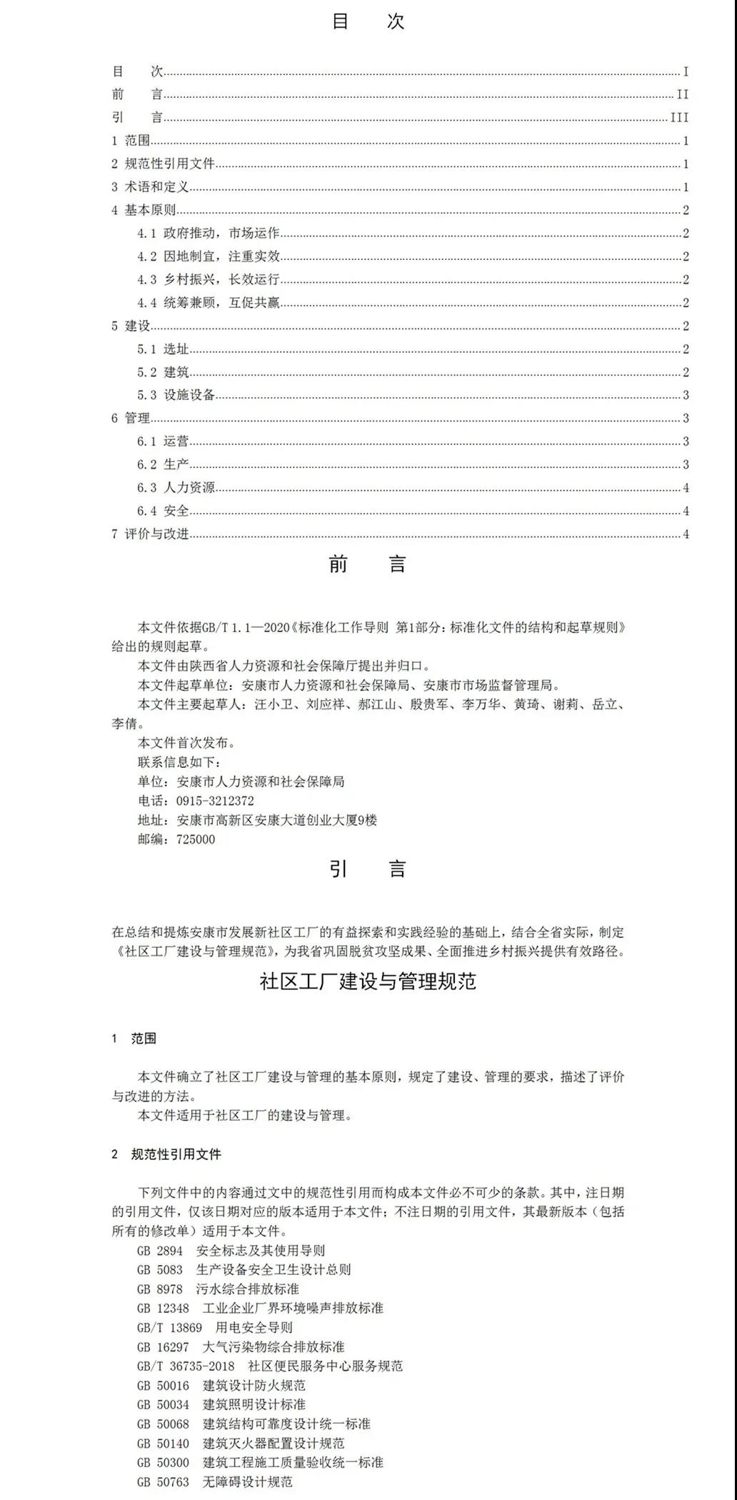 2020年6月,安康市人社局申请陕西省地方标准的立项,同年7月,陕西省市场监督管理局批准同意该标准制定。安康市人社局联合安康市市场监督管理局共同成立标准起草组,形成标准草案。历时两年时间在全省范围内实地调研,通过书面征求意见,反复修订完善,专家评议审查等程序,最终形成报批稿。该标准分别从范围、规范性引用文件、术语与定义、基本原则、建设、管理、评价与改进等七方面对社区工厂的建设与管理予以规范明确。