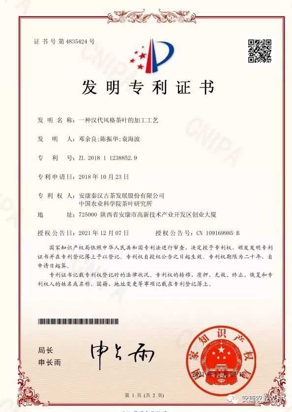 近日,由安康秦汉古茶发展股份有限公司和中国农业科学院茶叶研究所联合申报的发明专利“一种汉代风格茶叶的加工工艺”获得国家知识产权局授权(专利号:ZL201811238852.9),自此安康最早的茶有了法律保障(专利法)。
